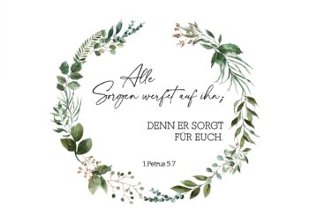 Die christliche Postkarte Alle Sorgen „1. Petrus 5:7“ vermittelt die beruhigende Botschaft: „Alle Sorgen werft auf ihn, denn er sorgt für euch.“ Dieser Bibelvers ermutigt dazu, sich in Zeiten der Unsicherheit nicht von Ängsten überwältigen zu lassen, sondern stattdessen alle Sorgen und Belastungen bei Gott abzugeben. Der liebevoll gestaltete Kranz aus zarten, grünen Blättern und floralen Akzenten umrahmt die Worte und verstärkt die friedvolle, tröstende Wirkung der Karte.