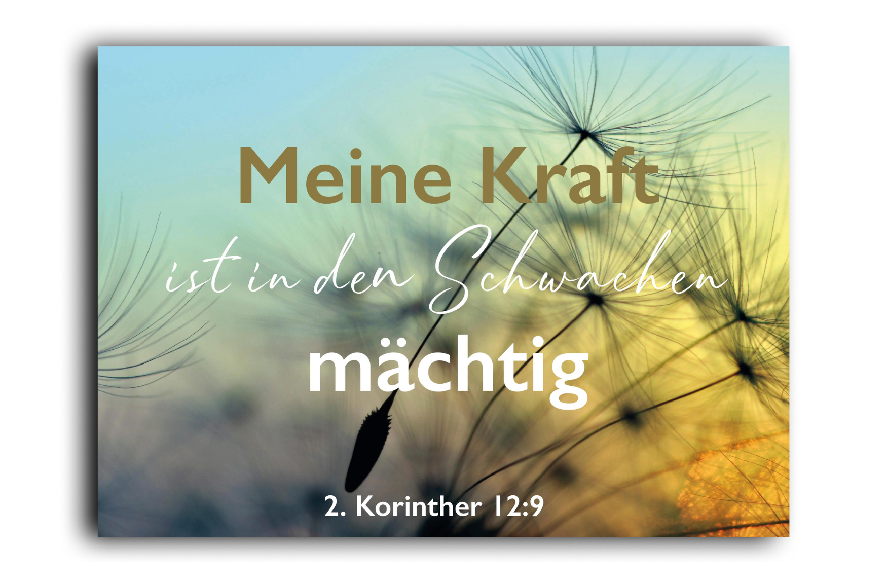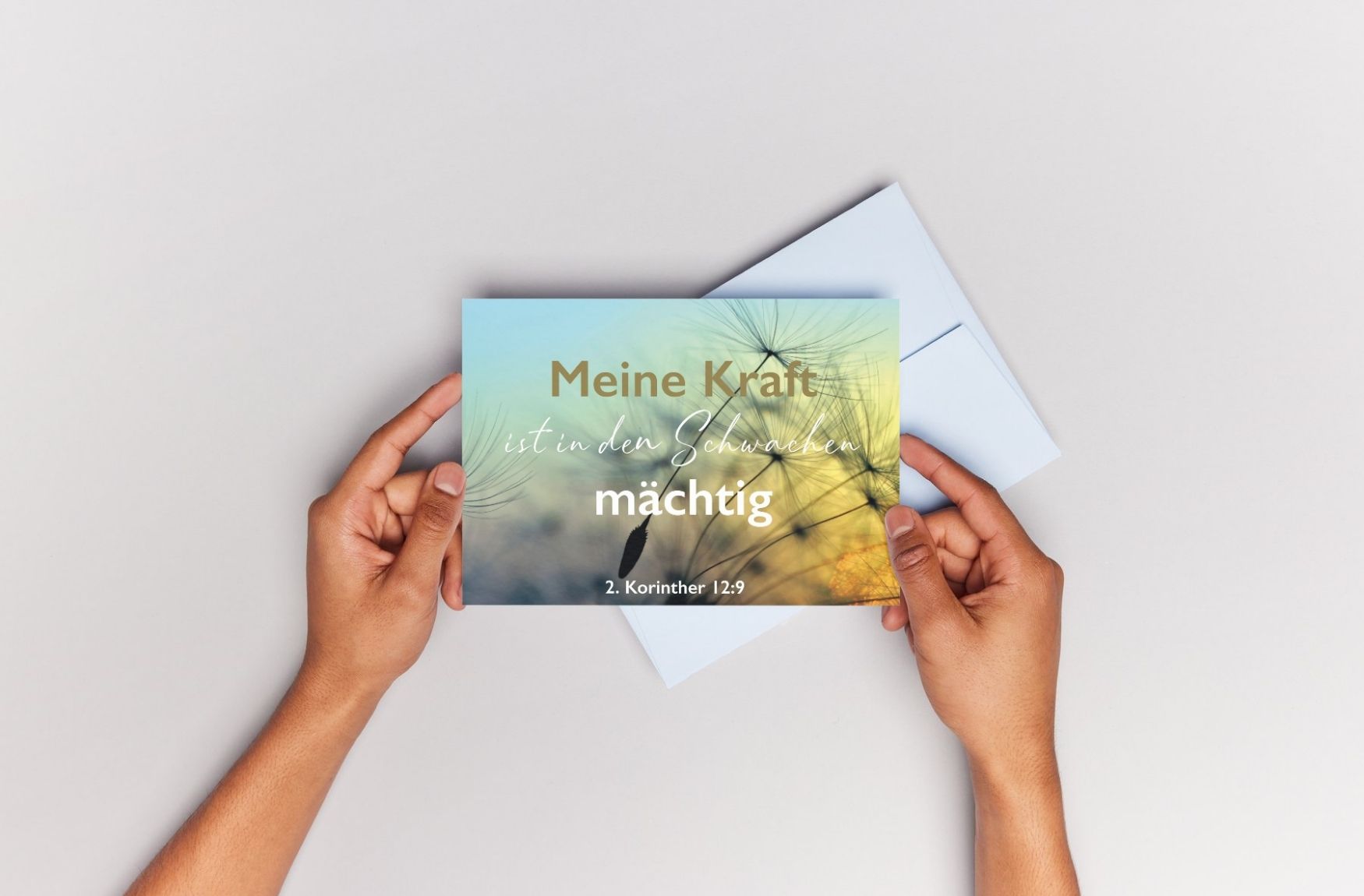 Die Postkarte Pusteblume lädt dazu ein, im Alltag innezuhalten und Gottes Kraft in der eigenen Schwäche zu entdecken. Sie spendet Trost und gibt neue Zuversicht.