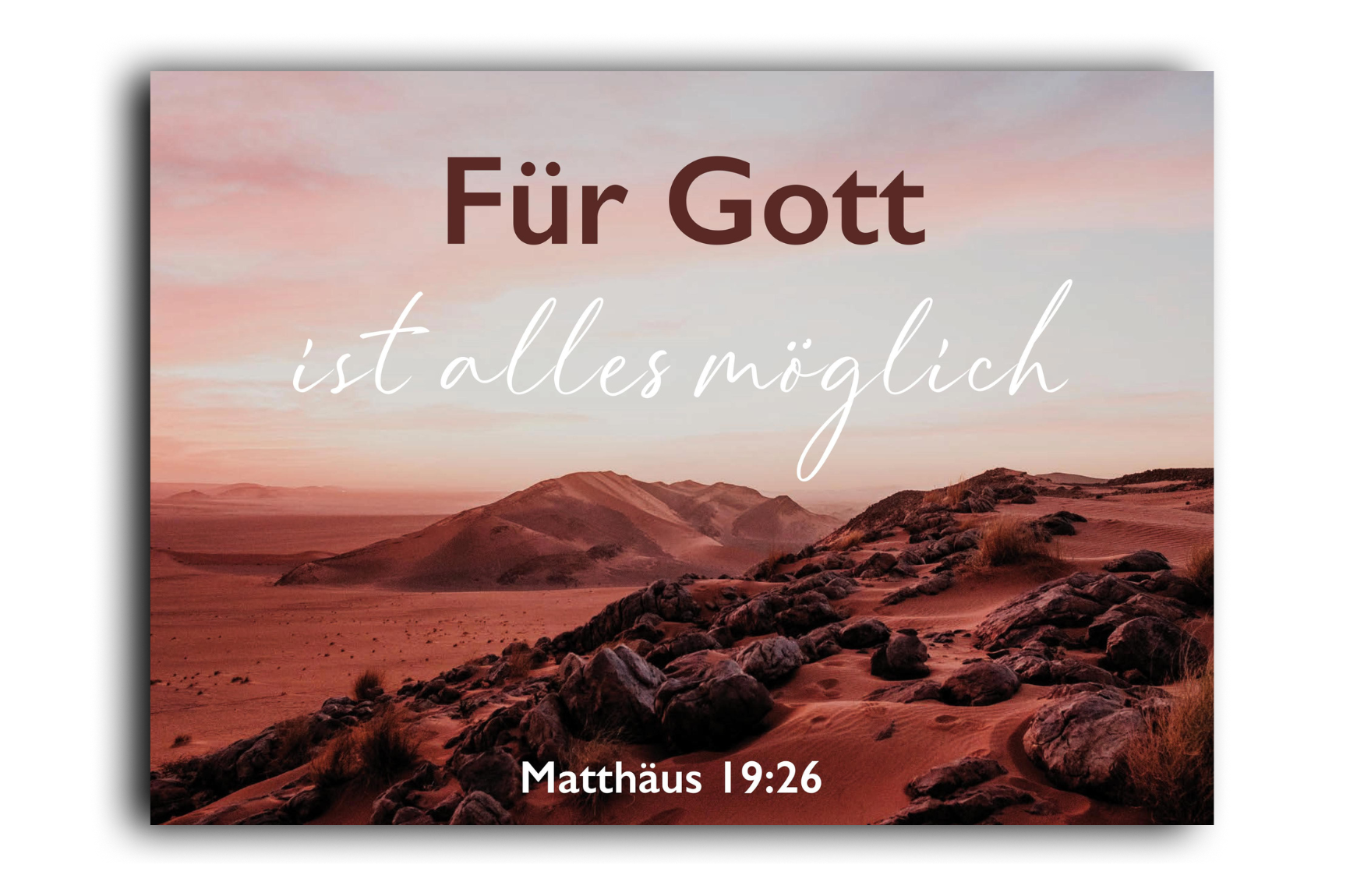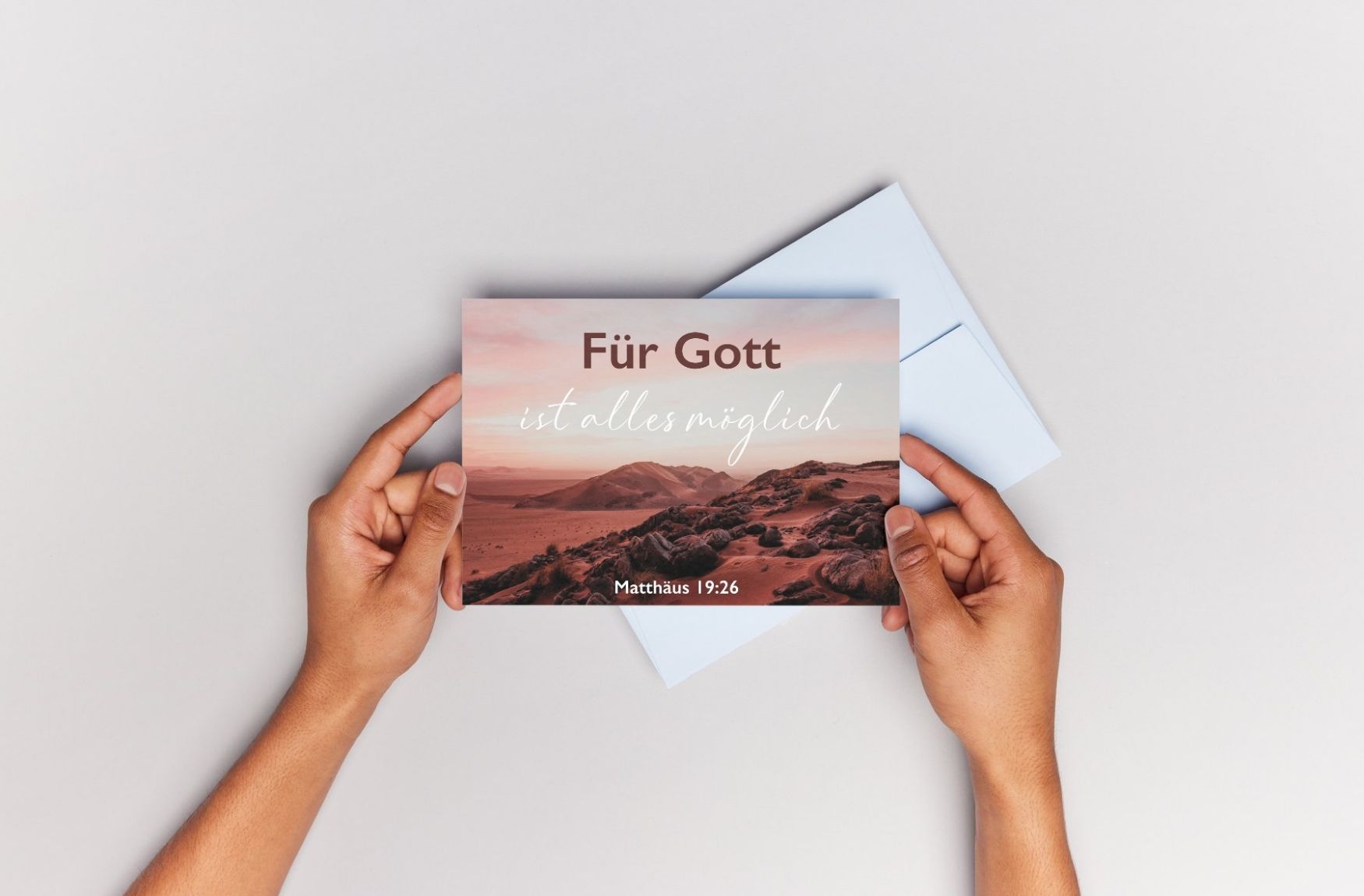 Die Postkarte Wüste lädt dazu ein, im Alltag innezuhalten und auf Gottes unbegrenzte Möglichkeiten zu vertrauen. Sie spendet Trost und schenkt neue Perspektiven.